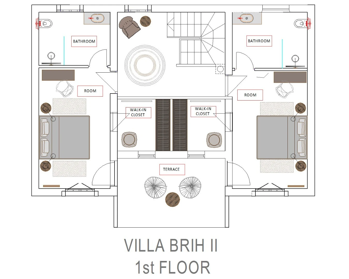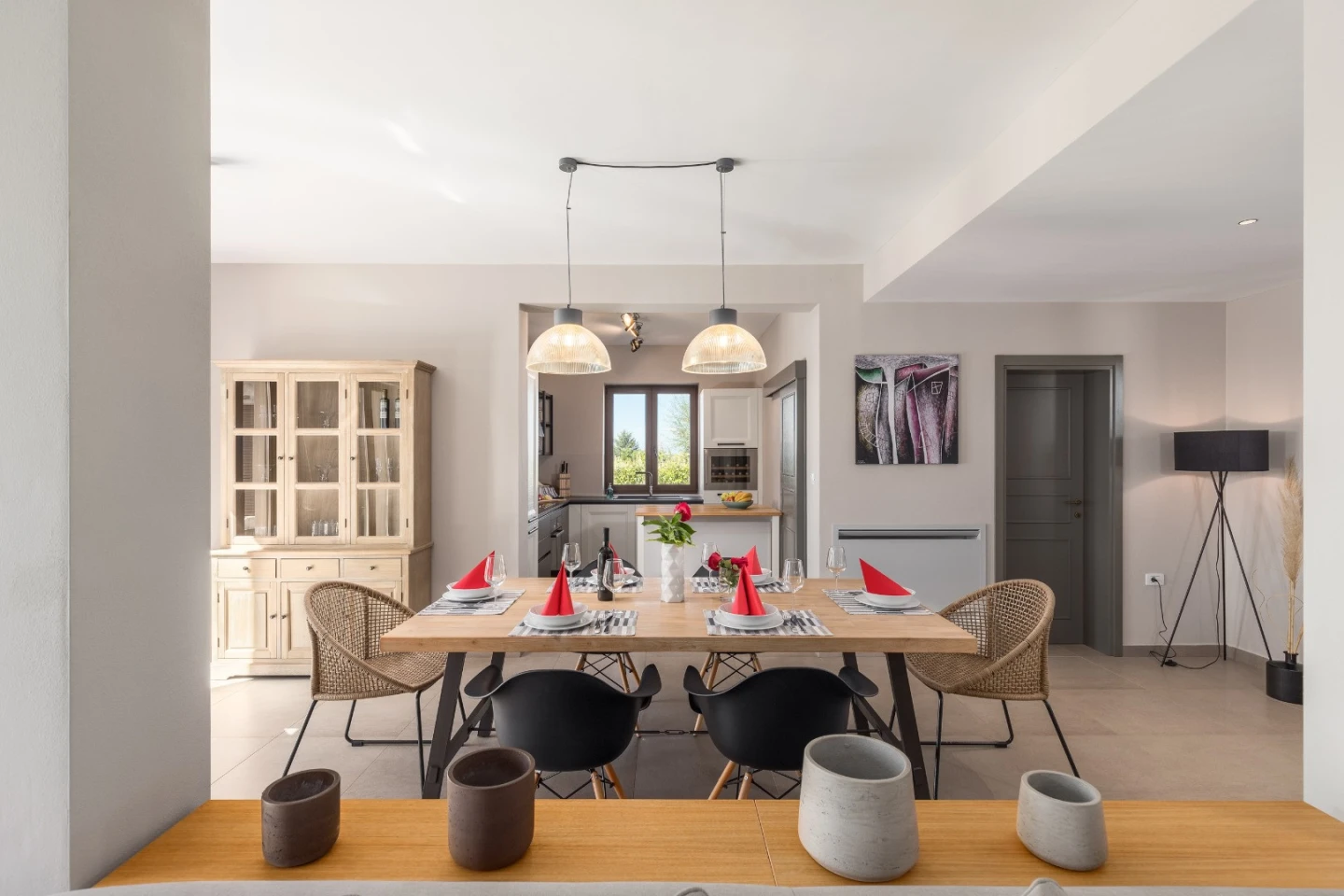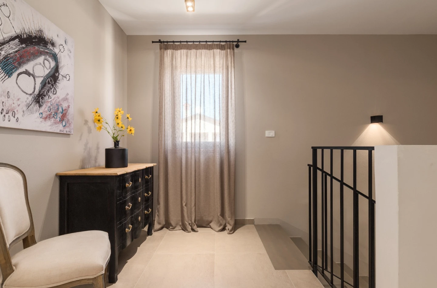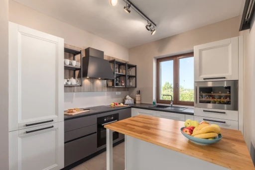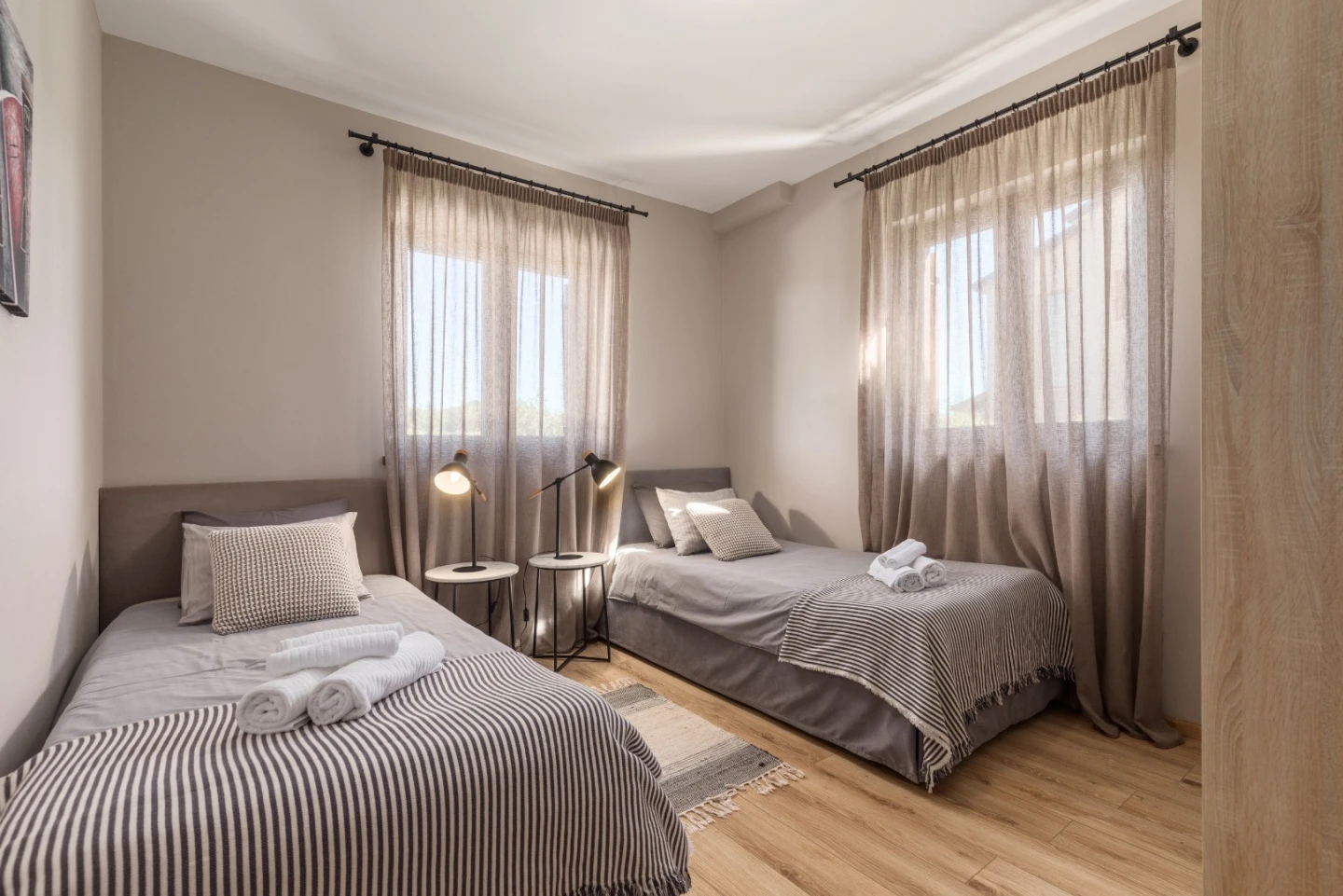 Built in 2018, Brih II is a new and modern villa which offers you all the amenities for a luxurious stay. This holiday home is completely furnished and equipped with all the standard facilities. On the ground floor you will find 2 bedrooms, one with 2 single beds, and one with a double bed. The rooms also have satellite TV, air-conditioning, and the ground floor bathroom has a washing machine. There is also a separate toilet. The kitchen, dining area and living room are also on the ground floor, fully equipped so you don't need to worry about anything more than the groceries. There is a dishwasher, electric kettle, toaster, cooker, and first and foremost – a coffee machine. There are two double bedrooms on the first floor, along with en-suite bathrooms and a wonderful balcony to enjoy the vineyards around the villa.